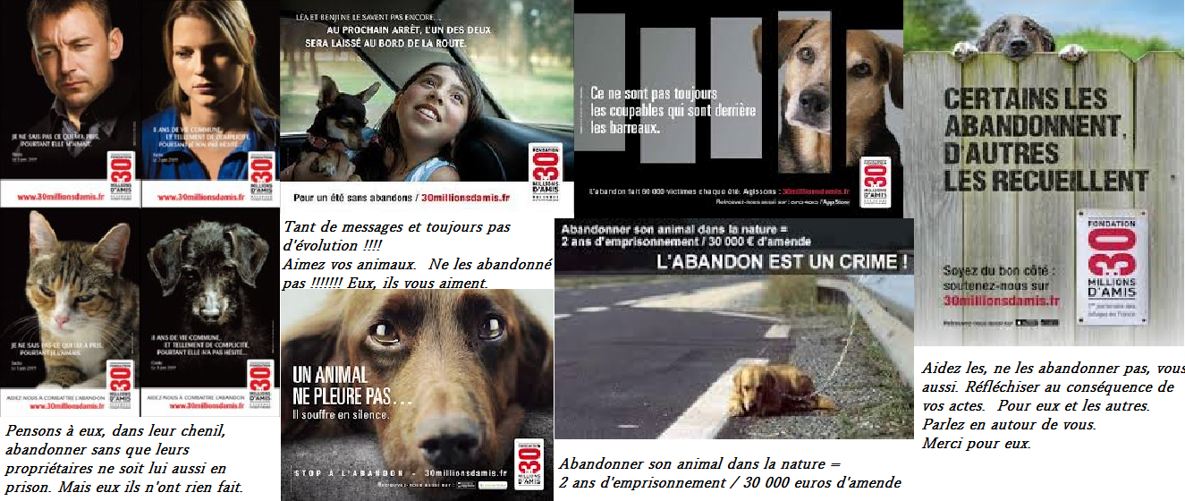 En France, toutes les heures, on abandonne plus de 11 animaux domestiques, soit environ 100 000 abandons par an, dont 60 000 l'été. La SPA en recueille une partie soit environ 40 000. Depuis le 1 janvier, plus de 40 000 animaux ont été abandonné. Faites passez cette image, parlez en autour de vous mais ne faites pas cette erreur, ne les abandonné pas !!!!!!!!